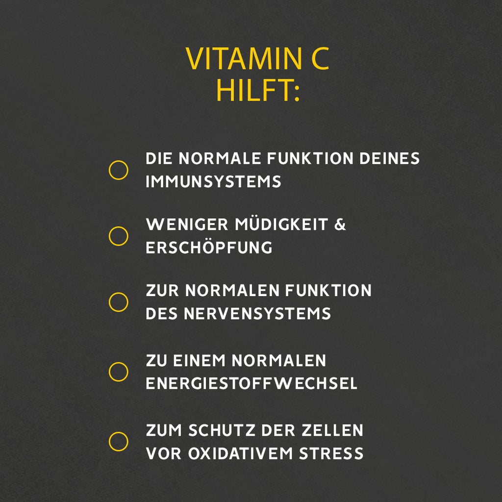 Vitamin C ist bekannt für seine immunstärkende Wirkung und wird besonders in der kalten Jahreszeit zur Vorbeugung von Grippe, Erkältungen und anderen Atemwegserkrankungen empfohlen. Vitamin C spielt eine wichtige Rolle im normalen Heilungsprozess von Gewebe, da es an der Kollagenproduktion beteiligt ist. Es trägt auch zur Aufnahme von Eisen bei, insbesondere von in Gemüse enthaltenem Eisen, was für eine vegetarische Ernährung von Vorteil sein kann. Vitamin-C-basierte Nahrungsergänzungsmittel können aufgrund langjähriger wissenschaftlicher Belege eine Reihe von gesundheitsbezogenen Angaben/Indikationen aufweisen: